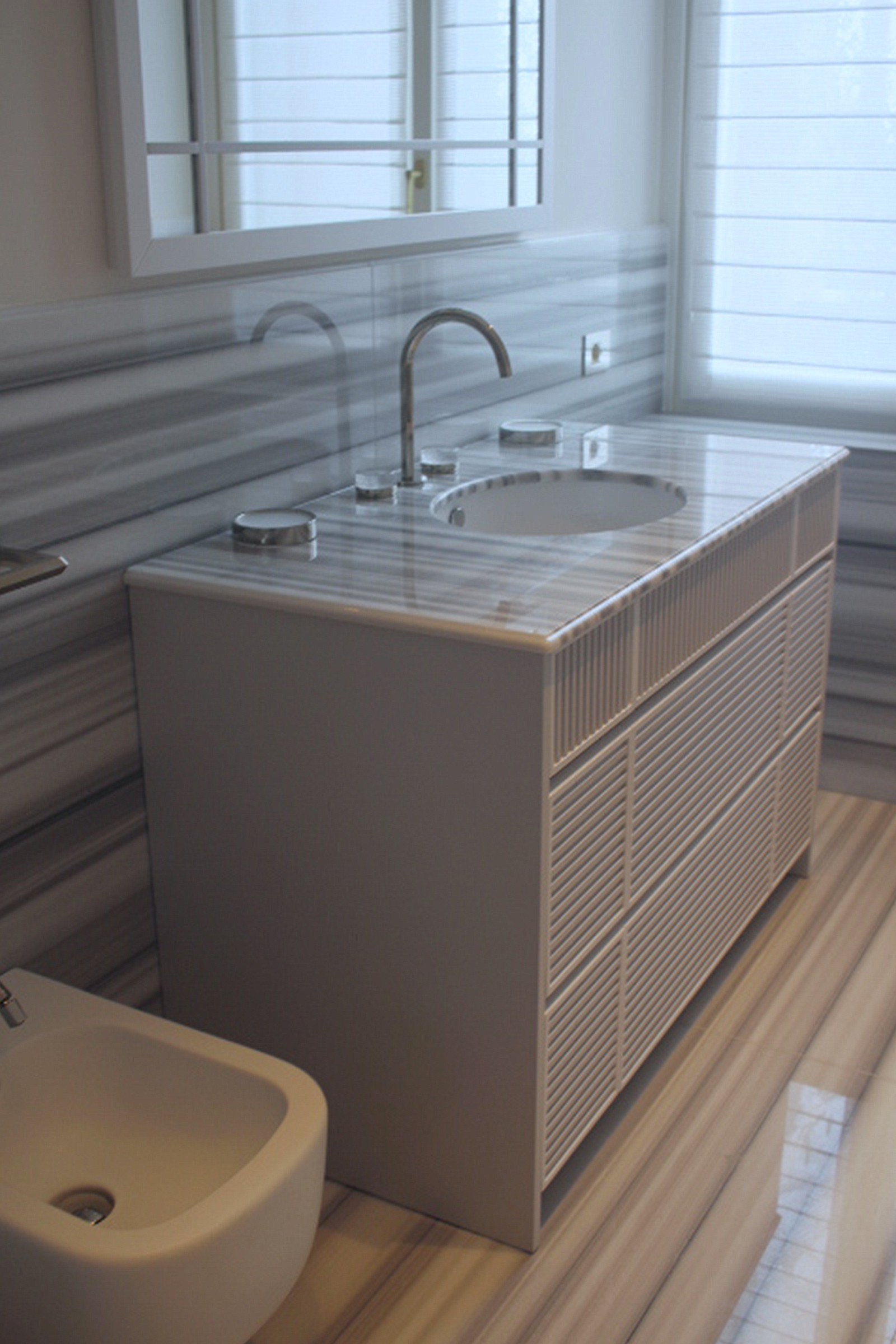 Le superfici sembrano avvolgere lo spazio con naturalezza, mentre le venature parallele del marmo accompagnano lo sguardo e amplificano la percezione di ampiezza.