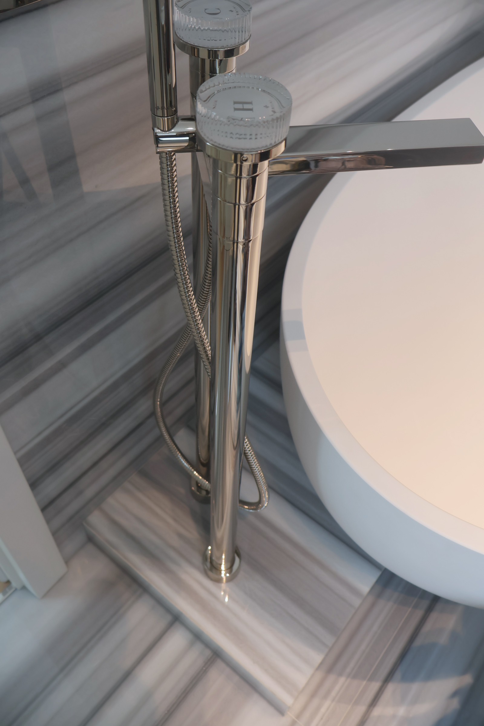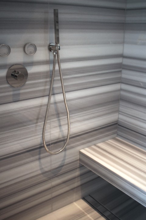 La scelta del materiale è ricaduta sul marmo Striato Olimpo, una pietra naturale di origine turca che si distingue per il suo fondo bianco puro, attraversato da venature grigie sottili e regolari, disposte in modo parallelo.