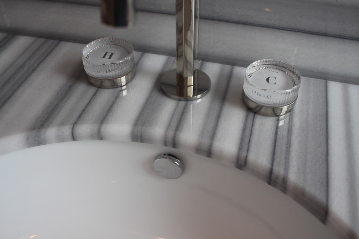 Per valorizzare al massimo la naturale eleganza del materiale, il marmo è stato lavorato con la tecnica della vena continua, un metodo che prevede il taglio sequenziale delle lastre in modo da mantenere la perfetta continuità delle venature.